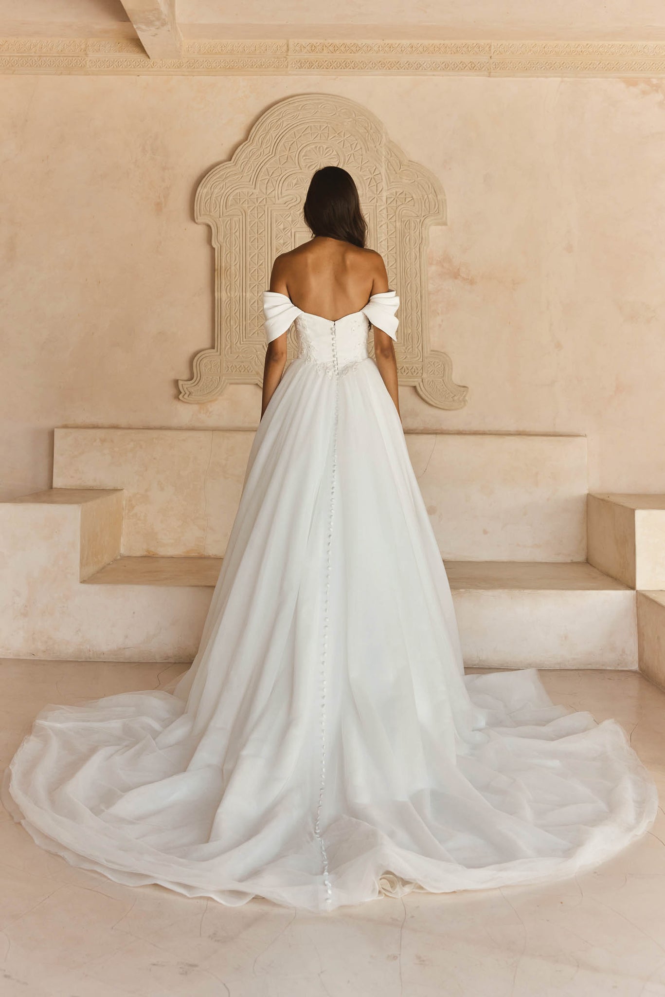 *Happiness Guarantee, terms + conditions: intent to exchange expressed within 24 hours from the time of pick up, gown to be picked up within seven days of purchase. The exchange must be equal or greater in value. One-time exchange for a different sample sale dress. Credit can be applied to any special order wedding dress. Credit must be used within 6 months from purchased.